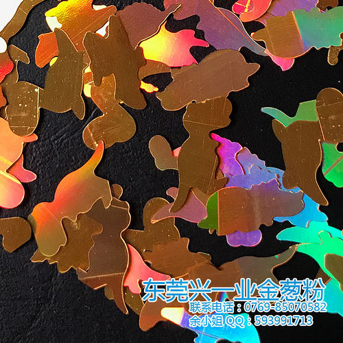 广东东莞兴一业金葱粉辅料产品包括各种规格颜色金葱粉、镭射金葱粉、幻彩金葱粉、铝质金葱粉,七彩金葱粉,五彩金葱粉,厂家直销,价格优惠!新款立体卡通亮片 可定制,日生产量可以达到4吨以上。